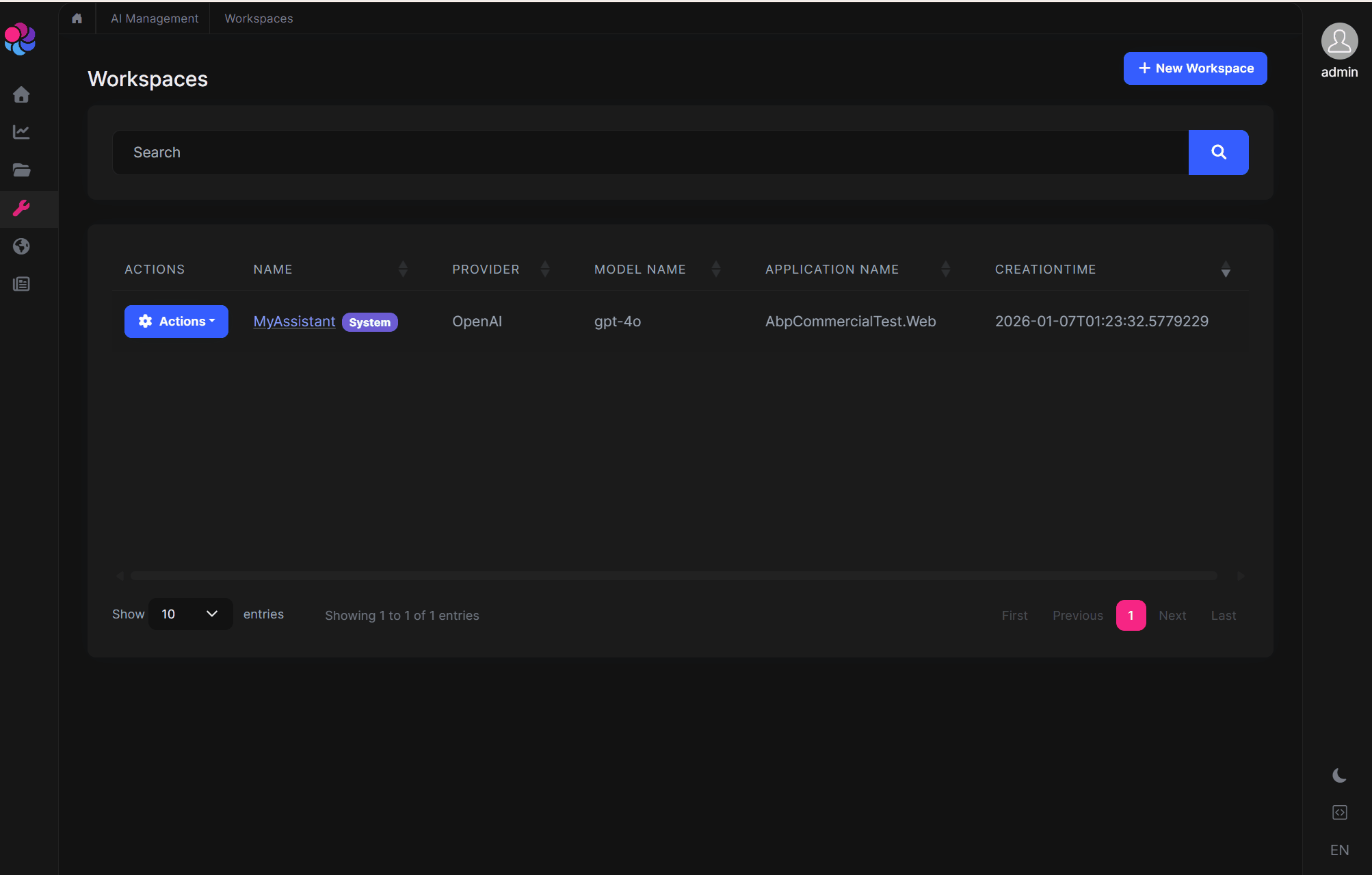 Built on top of the ABP Framework's AI infrastructure, the AI Management Module allows you to manage AI workspaces dynamically without touching your code. Whether you're building a customer support chatbot, adding AI-powered search, or creating intelligent automation workflows, this module provides everything you need to manage AI integrations through a user-friendly interface.