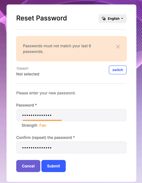 When changing a password, the system checks the specified number of previous passwords and displays an error message if the new password matches any of them: