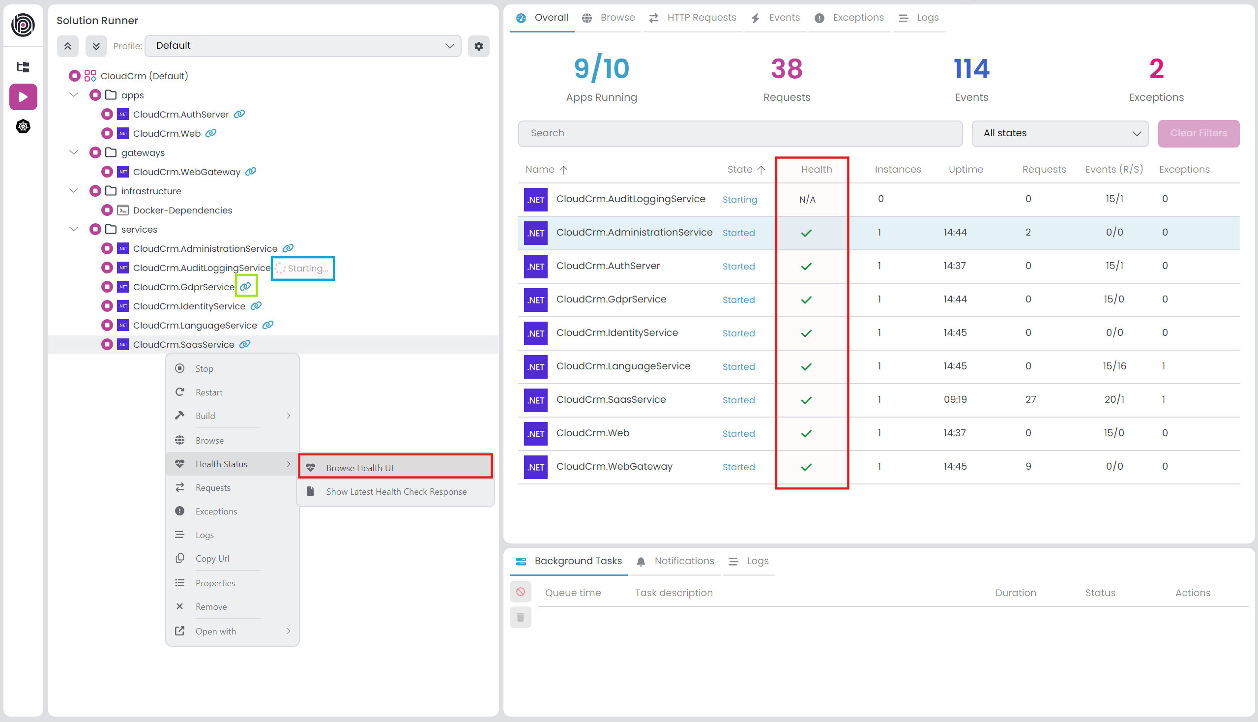 ABP Studio's Solution Runner now provides visual health monitoring that makes tracking your applications' status easily. When you start an application, a spinner indicates it's "starting", then in the Overall tab, you can see the application's health (✅ for healthy, ⚠️ for unhealthy) that displays real-time health status: