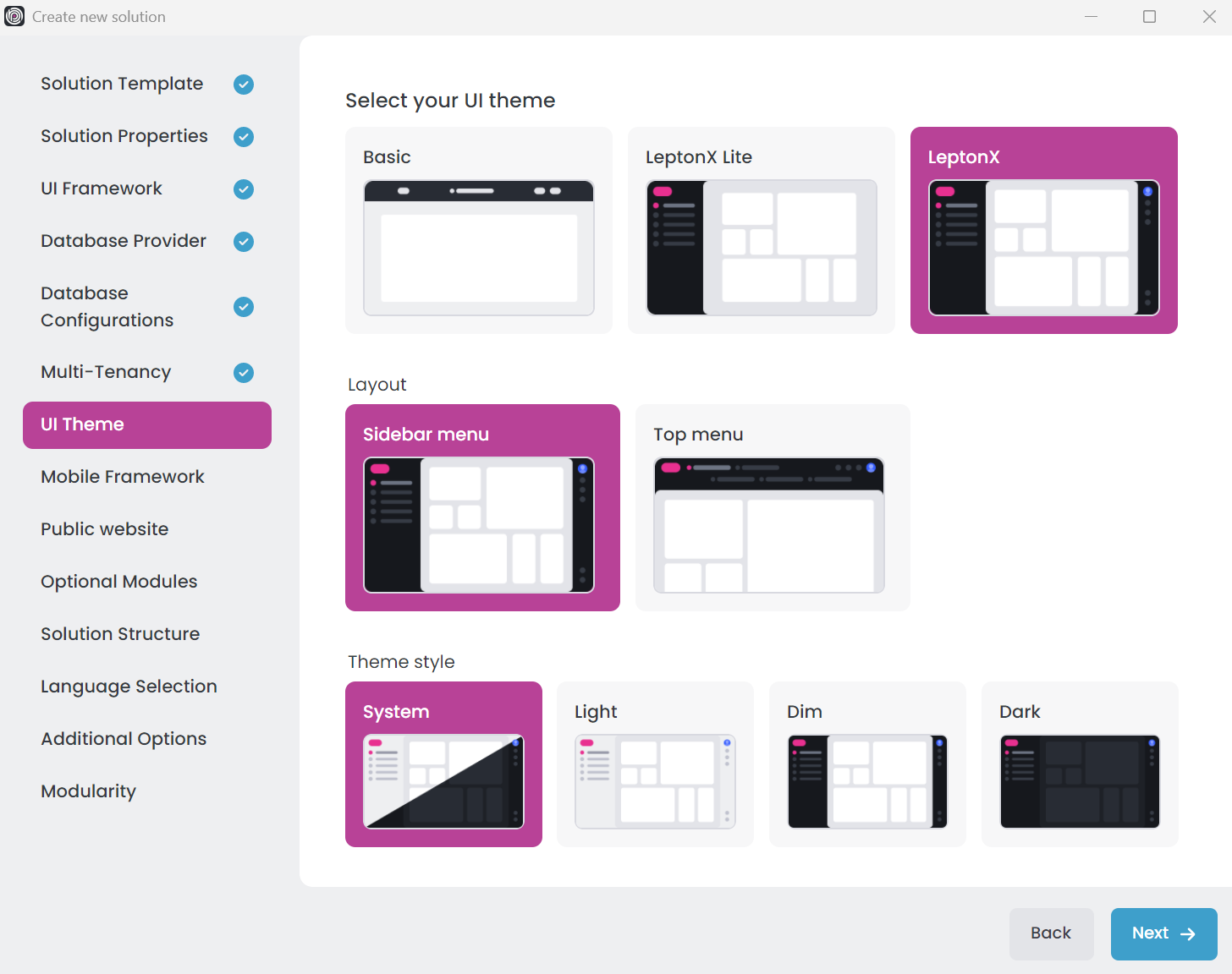 When creating a new solution, you can now choose your theme, theme style, and layout right from the project creation wizard instead of having to configure these settings later. ABP Studio lets you pick from ABP's officially provided themes including Basic, LeptonX Lite, and LeptonX.