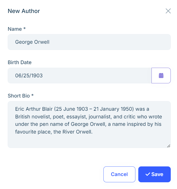 As you can see, the Name field is required, the Birth Date field shows a datepicker, and the Short Bio field is also required and it's a textarea. You just configured how you want your properties with some options (for example, setting the short bio as textarea and required), and ABP Suite generated code according that.