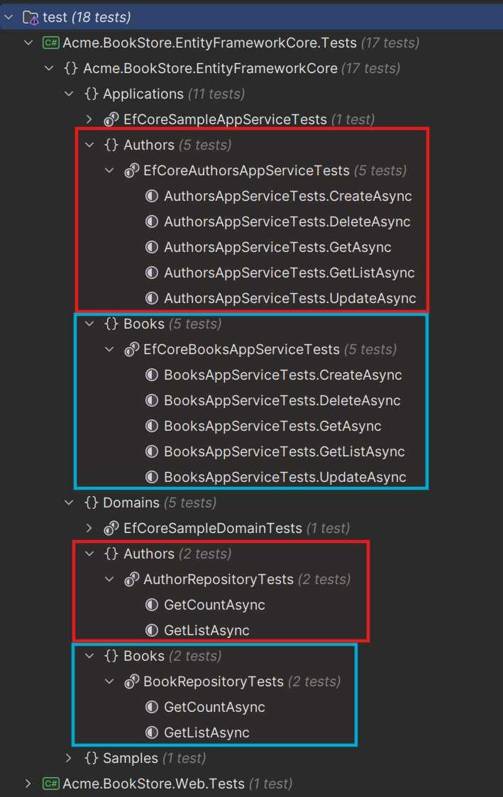 Let's examine one of the generated test classes. Open the BooksAppServiceTests (under the test/Acme.BookStore.Application.Tests/Books/BookApplicationTests.cs) and check the CreateAsync