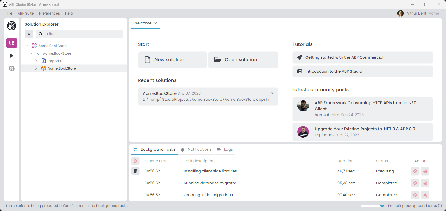 After clicking the Create button, the dialog is closed and your solution is loaded into ABP Studio: