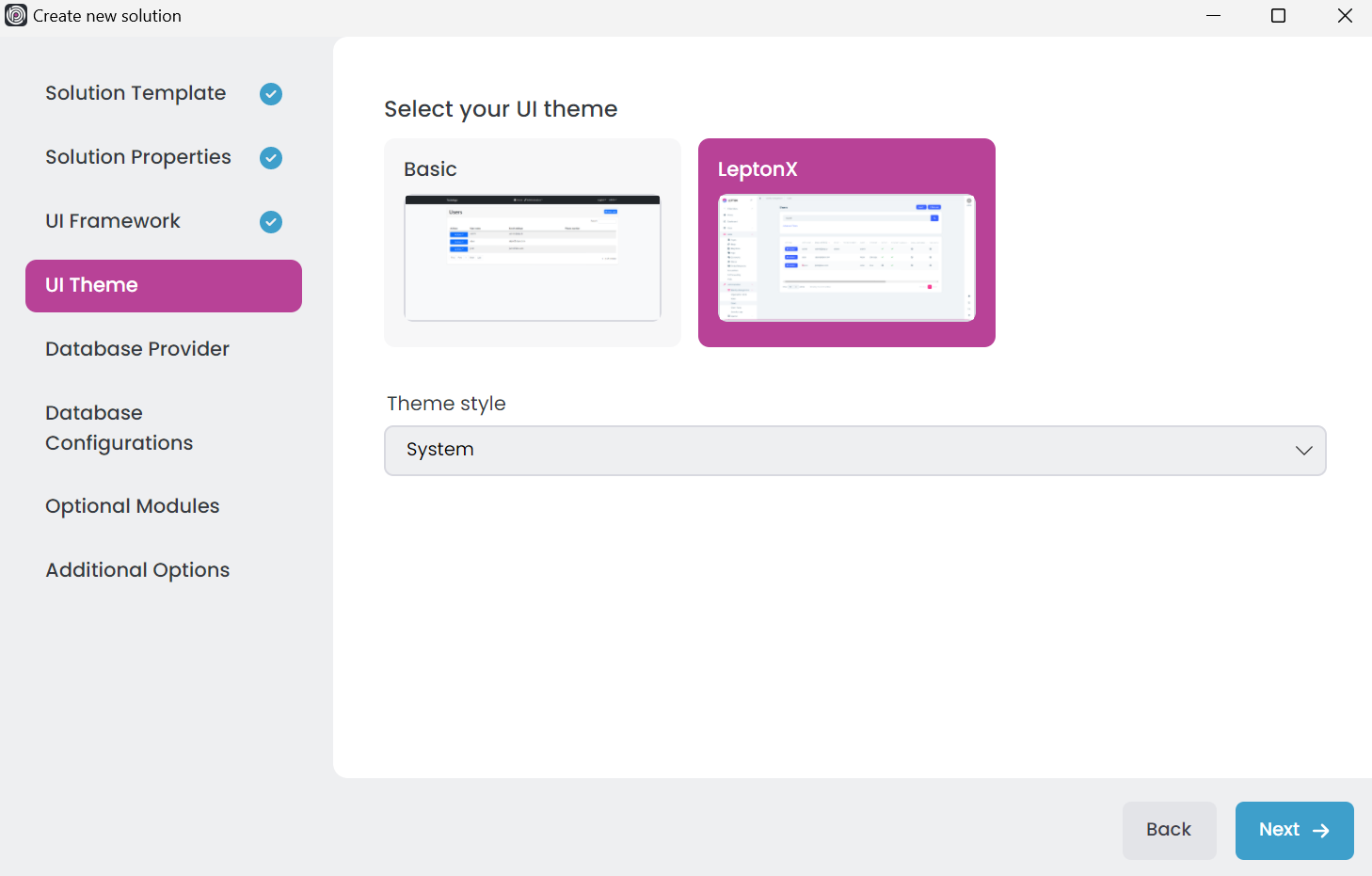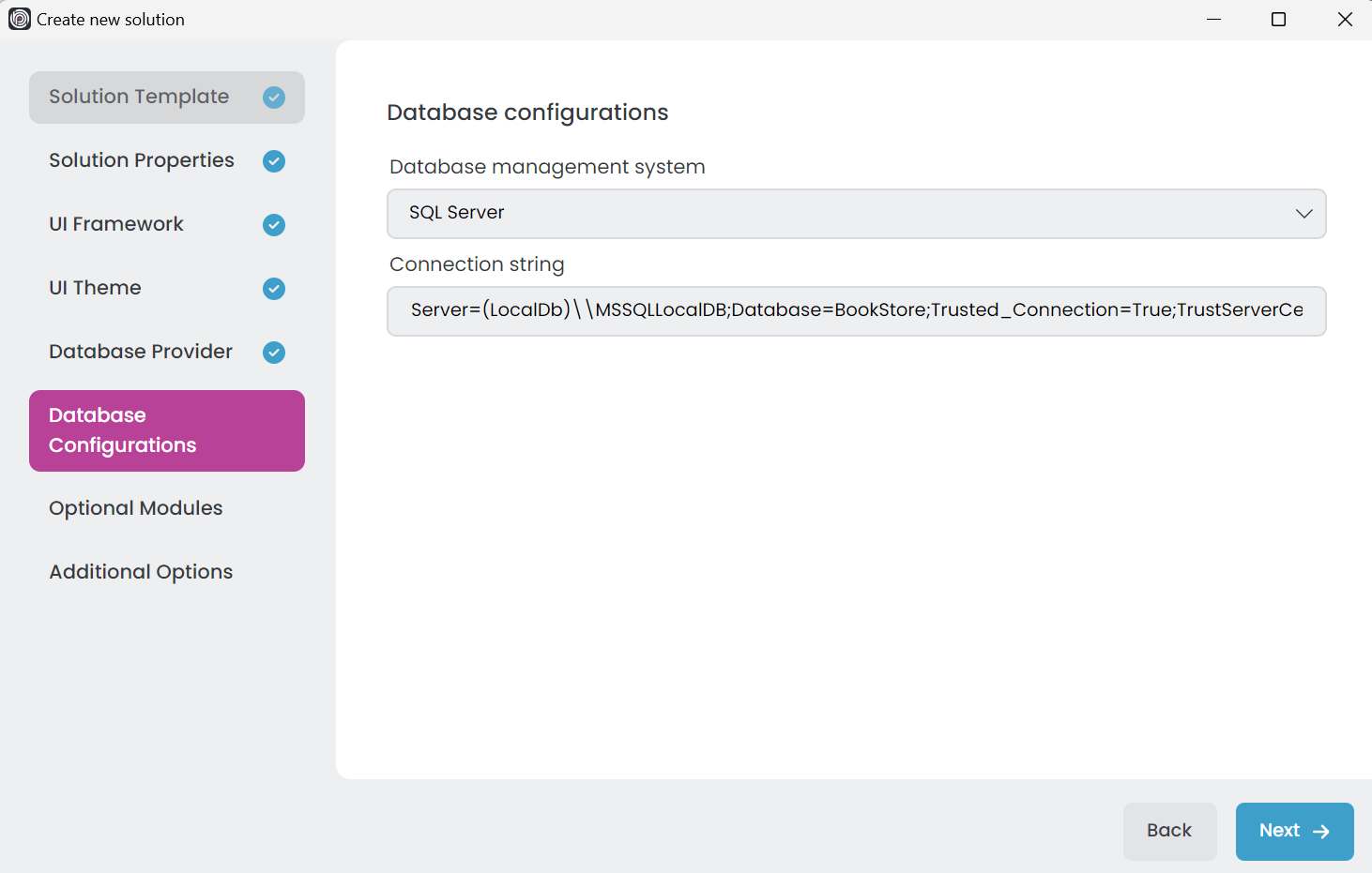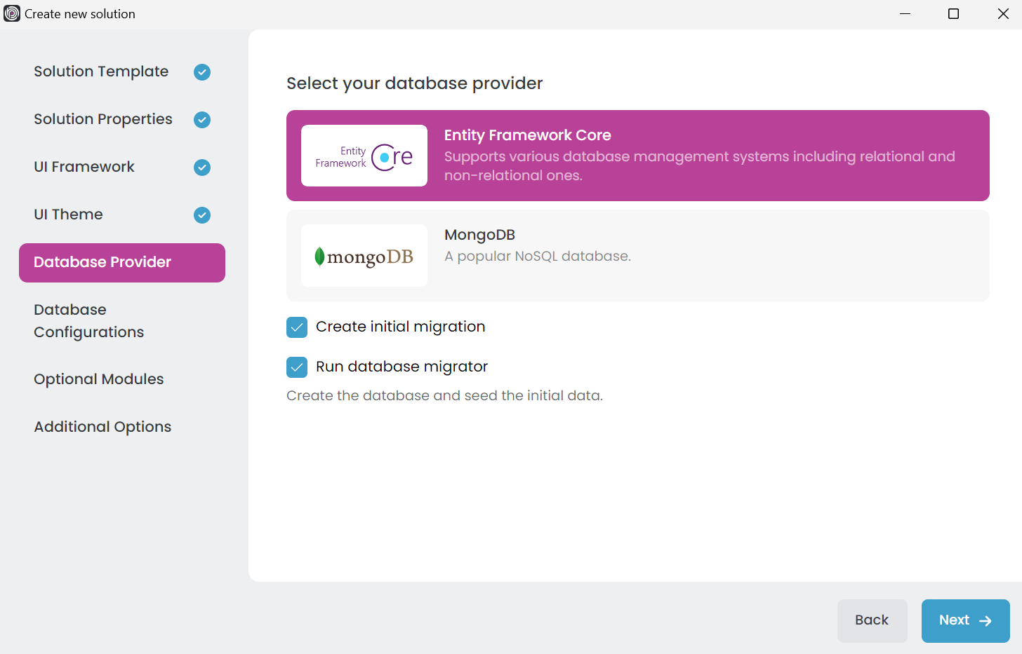Notice that; Once you select a UI type, some additional options will be available under the UI Framework list. You can further configure the options or leave them as default and click the Next button for the Database Provider selection screen: