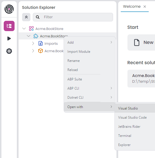 You can use ABP Studio to open the solution with Visual Studio. Right-click to the Acme.BookStore module, and select the Open with -> Visual Studio command: