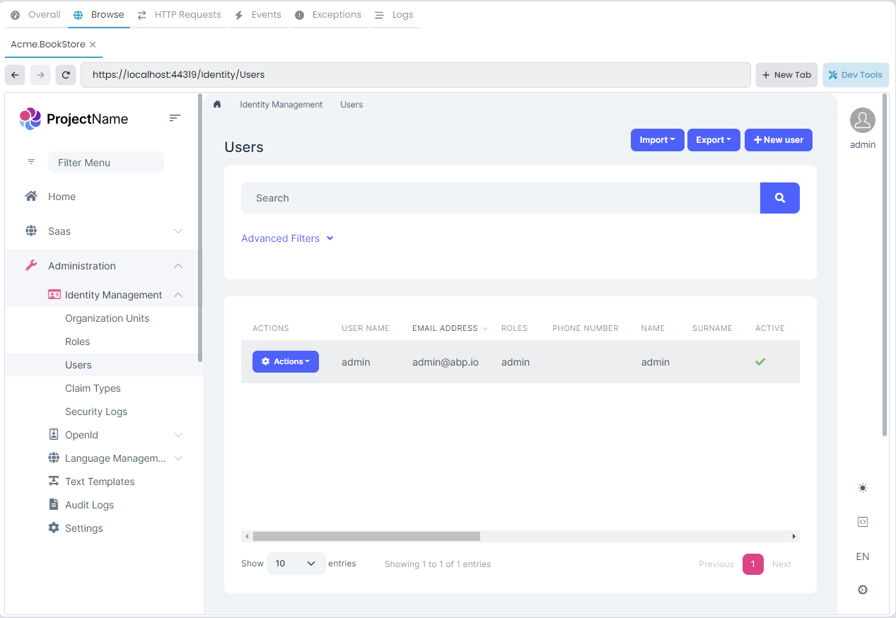 The following screenshot was taken from the User Management page of the Identity module that is pre-installed in the application: