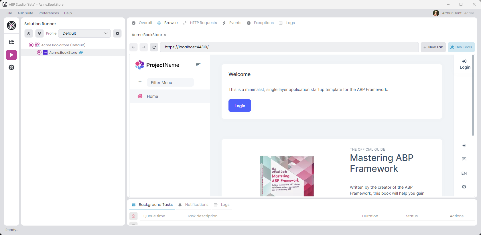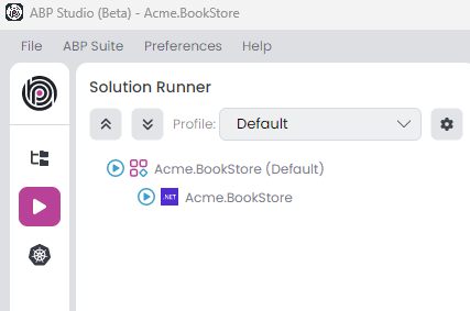 After creating your solution, you can open it in your favorite IDE (e.g. Visual Studio, Visual Studio Code or Rider) and start your development. However, ABP Studio provides a Solution Runner system. You can use it to easily run and browse your applications in your solution without needing an external tool.