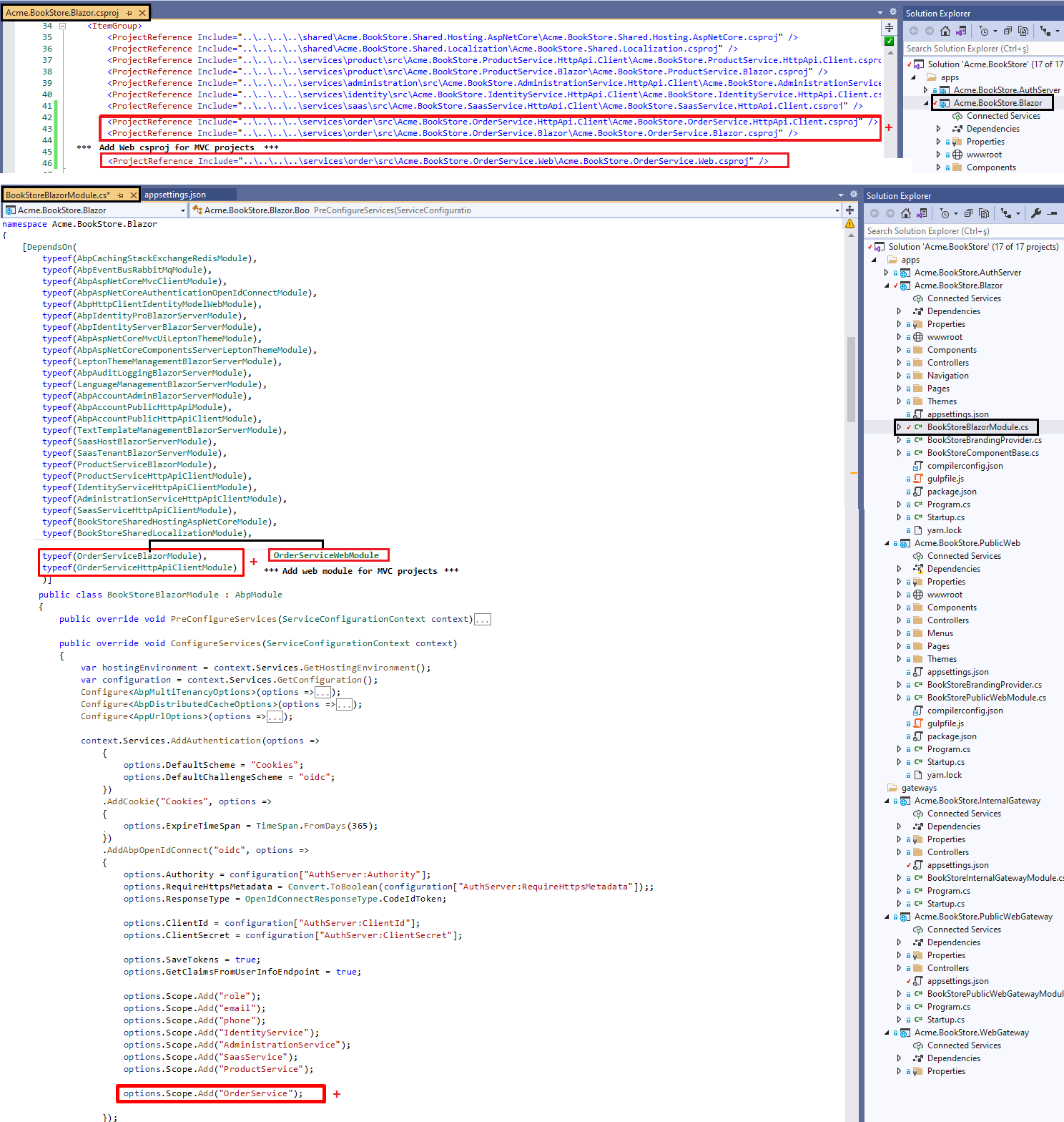• Update file appsetting.json: Add OrderService with its address and port in the OpenIddict/Resources schema, the appsettings.json must be updated in Acme.BookStore.DbMigrator and Acme.BookStore.IdentityService.HttpApi.Host.DbMigrations.