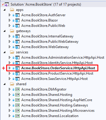 This is an optional step. If you want to see the OrderService in the main solution, add Acme.BookStore.OrderService.HttpApi.Host.csproj as an existing project to your main solution under the services folder. This will help you manage the host projects from single solution. While you can add it by Visual Studio (or any other IDE you are using), you can also run the following dotnet CLI command to add the Host project.
