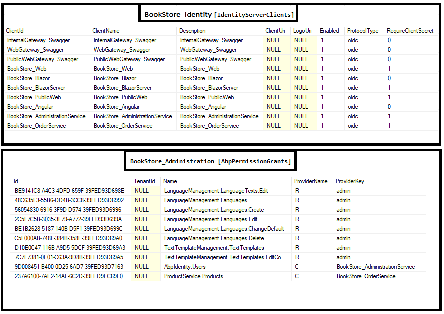When the databases are seeded, BookStore_Identity.IdentityServerClients database should have a new client and BookStore_Administration.AbpPermissionGrants should be seeded with ProviderName C: