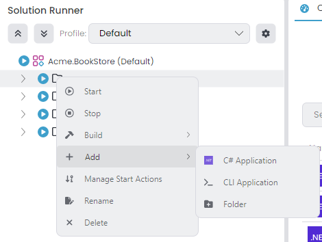 We can add any powershell file to execute from the solution runner. With this flexibility we can prepare our infrastructure environment such as Docker-Dependencies or run different application types like Angular. You can add CLI applications with root of the tree and right-click, in this example Acme.BookStore(Default) -> Add -> CLI Application.