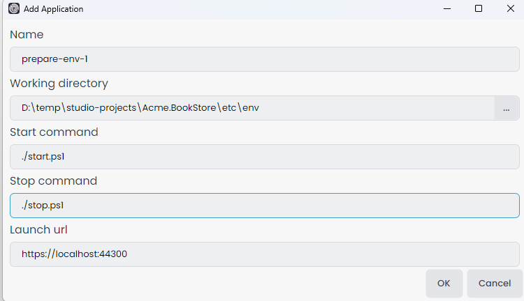 Acme.BookStore.AuthServer,Acme.BookStore.Web,Acme.BookStore.WebGateway, etc., are C# applications. - CLI Application: We can add powershell commands to prepare some environments or run other application types than C# such as angular.