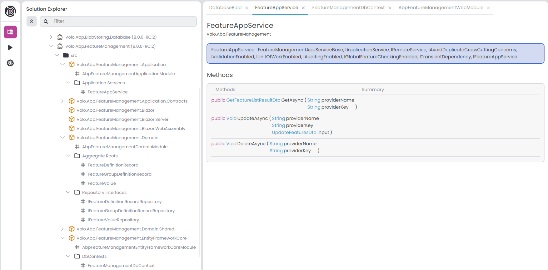 To view module details, click the Load Details button for the imported modules. This will show us the analyzed module details, including Aggregate Roots, Application Services, Domain Services, EF Core DB Contexts, Features, Mongo DB Contexts, Permissions, Repository Interfaces, and Settings. When we click the item in the list, it will open the details in main panel as a tab where you can view methods, properties, implementations, etc.