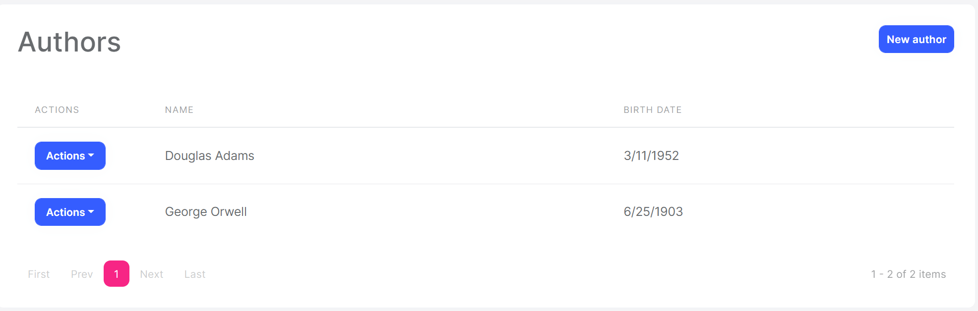 The page is fully working except New author and Actions/Edit since we haven't implemented them yet.