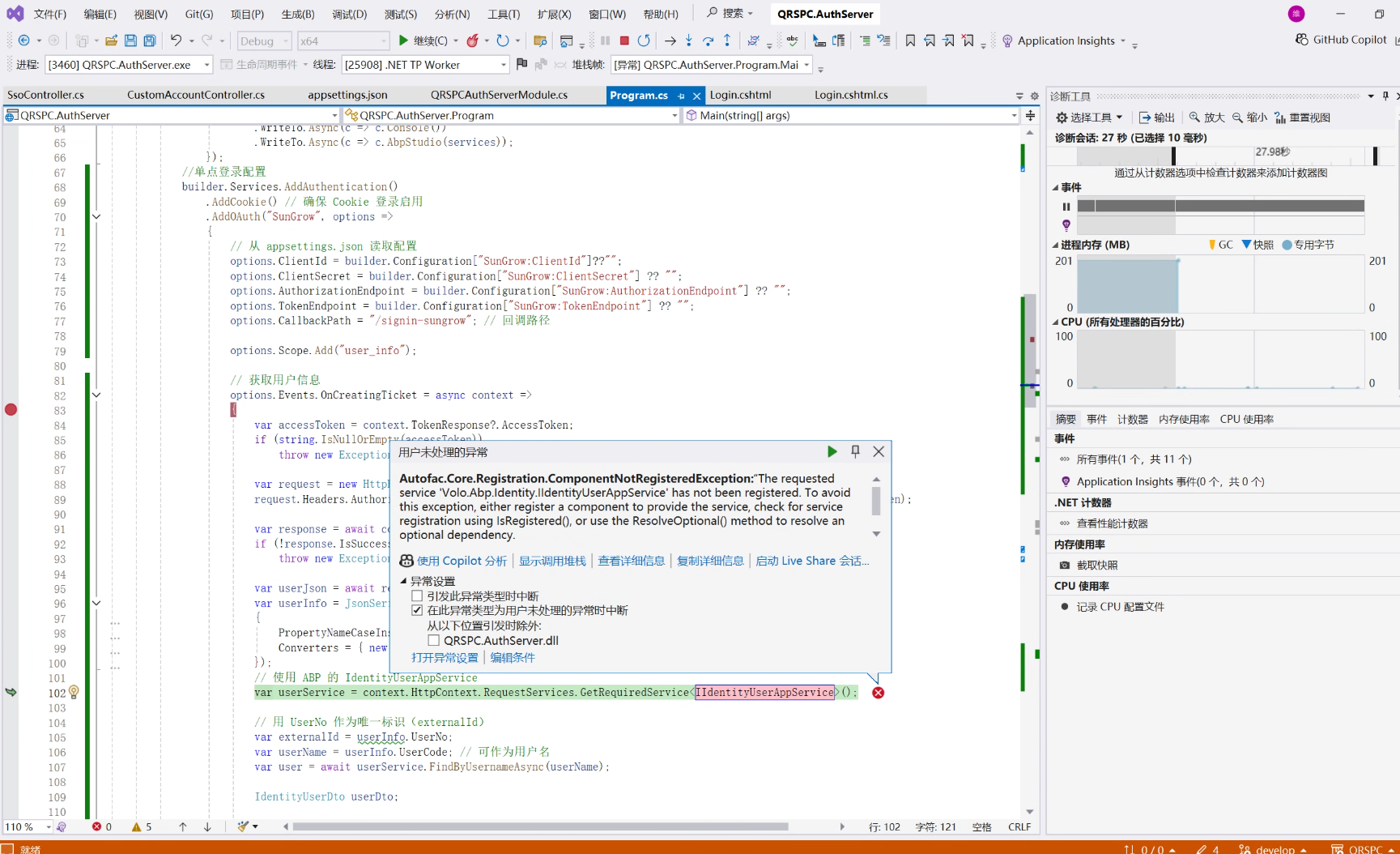 你的 AuthServer 只注册了 AbpIdentityProEntityFrameworkCoreModule,但没有注册 AbpIdentityProApplicationModule 或 AbpIdentityApplicationModule,导致 IIdentityUserAppService 没有被依赖注入容器注册。