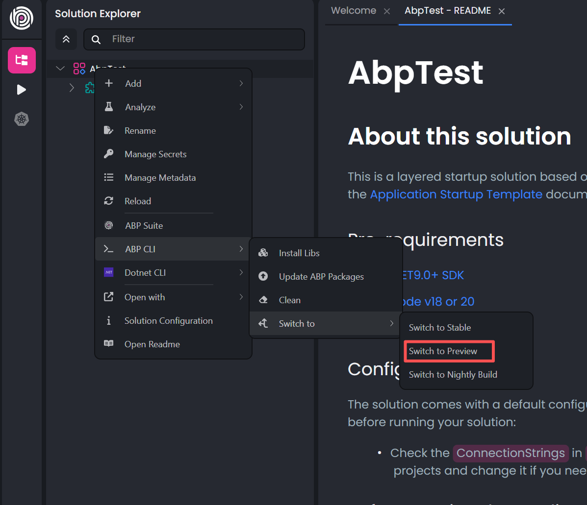 - After the solution is created, use the "Switch to Preview" option in ABP Studio (right-click solution > ABP CLI > Switch to > Switch to Preview).