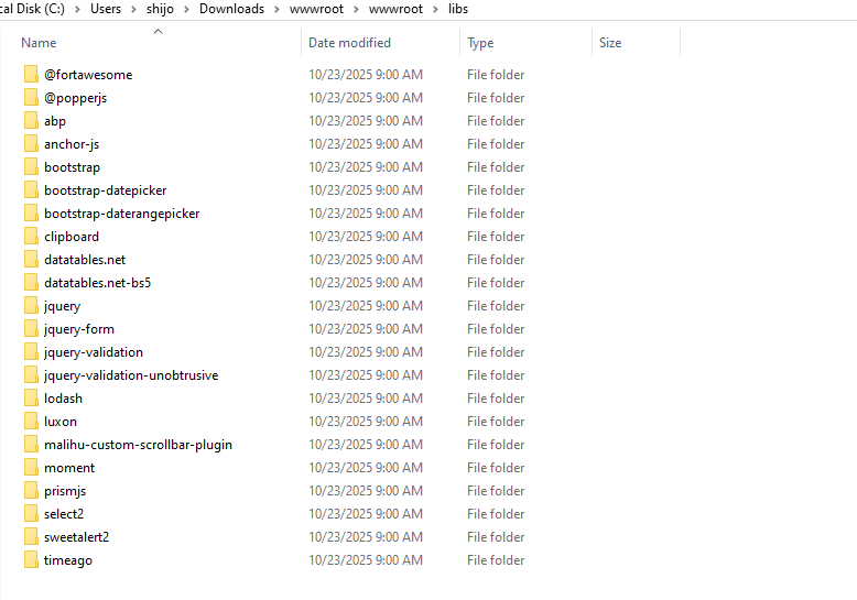 Webfolder and run theabp install-libscommand to create thelibsresources.{ "version": "0.1.0", "name": "volo.docstestapp", "private": true, "dependencies": { "@abp/aspnetcore.mvc.ui.theme.basic": "~9.3.5", "@abp/docs": "~9.3.5" } }Thanks