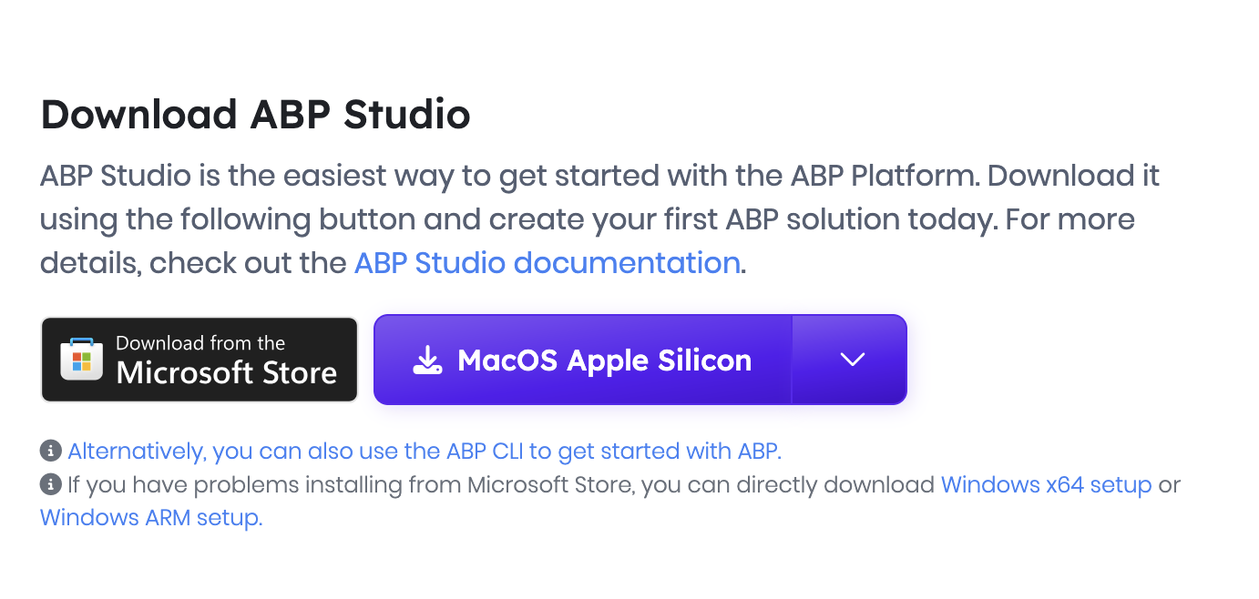 - In the Installation section, use the ABP Studio page link to download for macOS Apple Silicon. If you already have ABP Studio, it will self-update from the abp.io release feed.