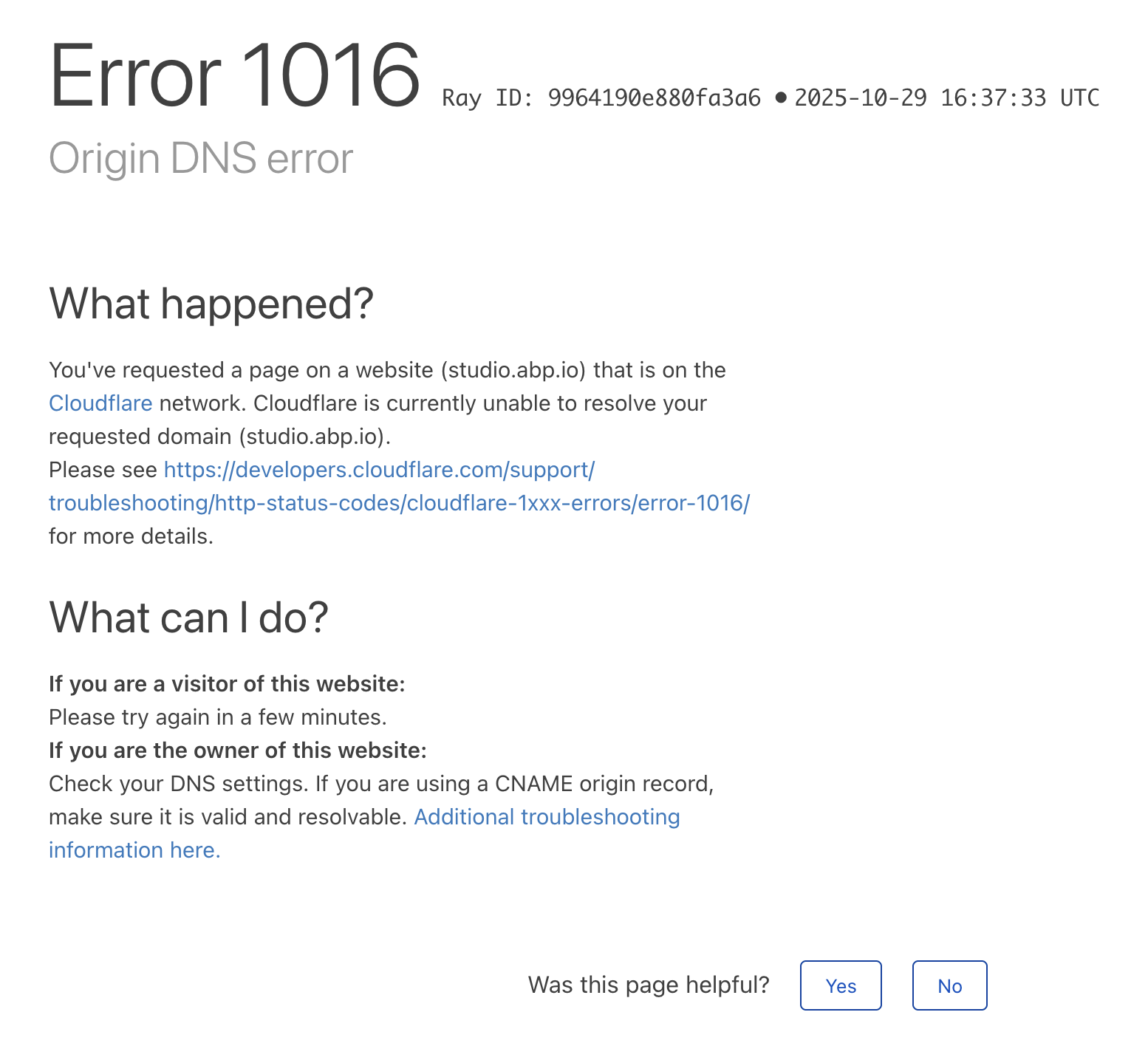 - The MacOS Apple Silicon button on abp.io/get-started currently points to a studio.abp.io download endpoint that is returning a Cloudflare 1016 Origin DNS error. That host is temporarily unreachable, so the button fails.