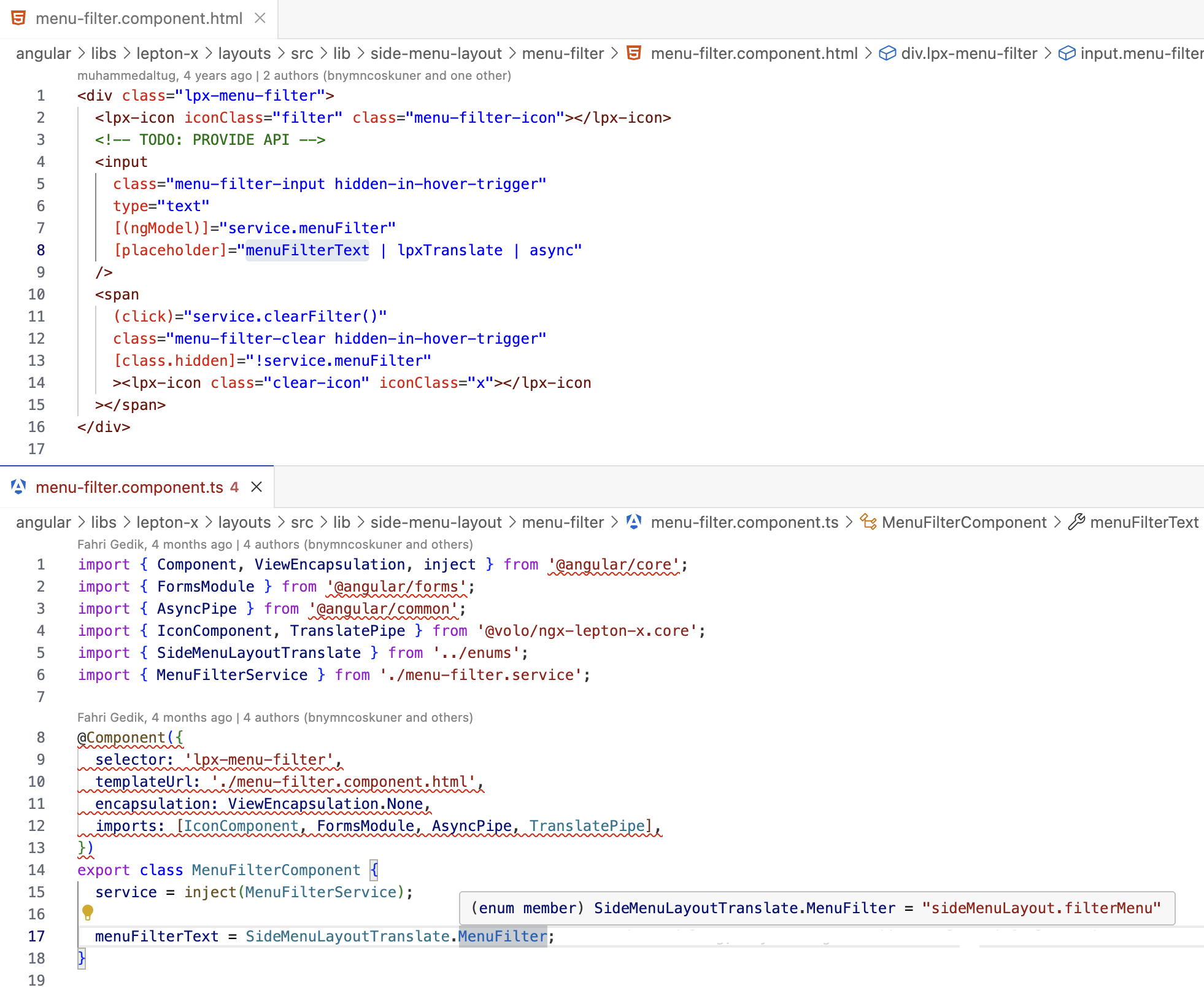 /// Custom Menu Filter Component /// IS TEMPORARY - TO BE REMOVED WHEN FIXED IN FUTURE RELEASE: https://abp.io/support/questions?sort=LastActivityDate-desc&creatorUserId=3a10d34c-87a0-a3f1-8e50-72cd7b2a718f&hidepinnedQuestions=True @Component({ selector: 'app-custom-menu-filter', imports: [CommonModule, FormsModule, LocalizationPipe], standalone: true, template: ` <div class="lpx-menu-filter"> <i class="bi bi-funnel menu-filter-icon"></i> <!-- TODO: PROVIDE API --> <input class="menu-filter-input hidden-in-hover-trigger" type="text" [(ngModel)]="service.menuFilter" [placeholder]="menuFilterText | abpLocalization" /> <span (click)="service.clearFilter()" class="menu-filter-clear hidden-in-hover-trigger" [class.hidden]="!service.menuFilter" > <i class="bi bi-x clear-icon"></i> </span> </div> `, }) export class CustomMenuFilterComponent extends MenuFilterComponent { override menuFilterText = 'LeptonX::FilterMenu' as SideMenuLayoutTranslate; }app.config.ts: