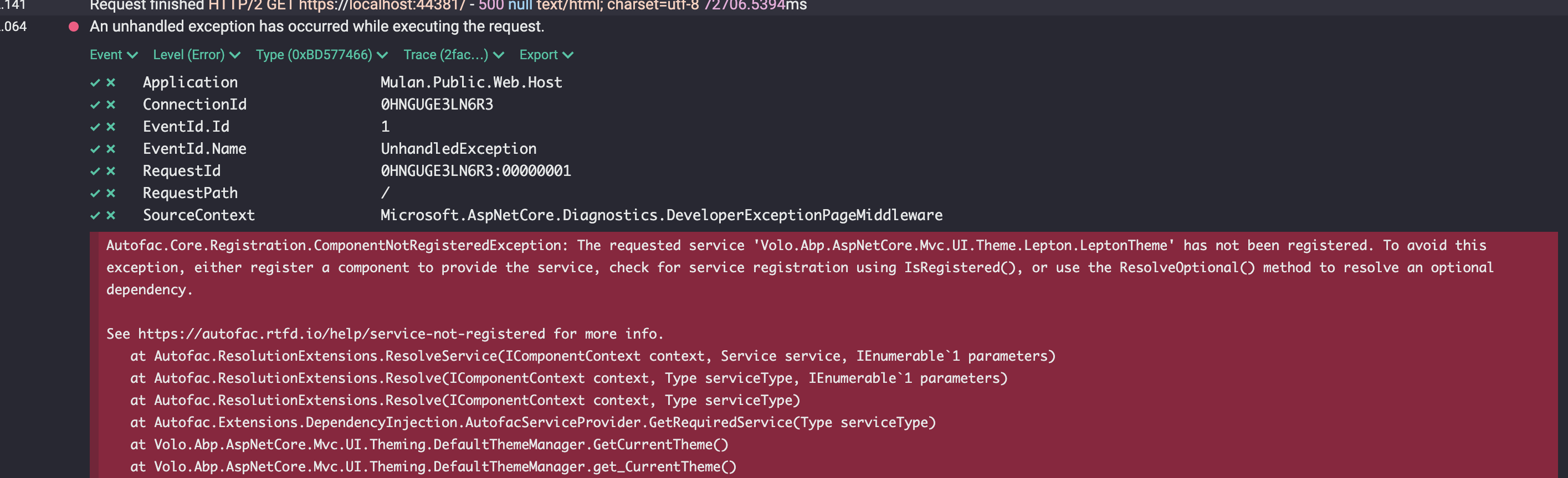 - Ensure you register the theme in AbpThemingOptions only once (DefaultThemeName should be LeptonXTheme.Name or let LeptonX register itself).