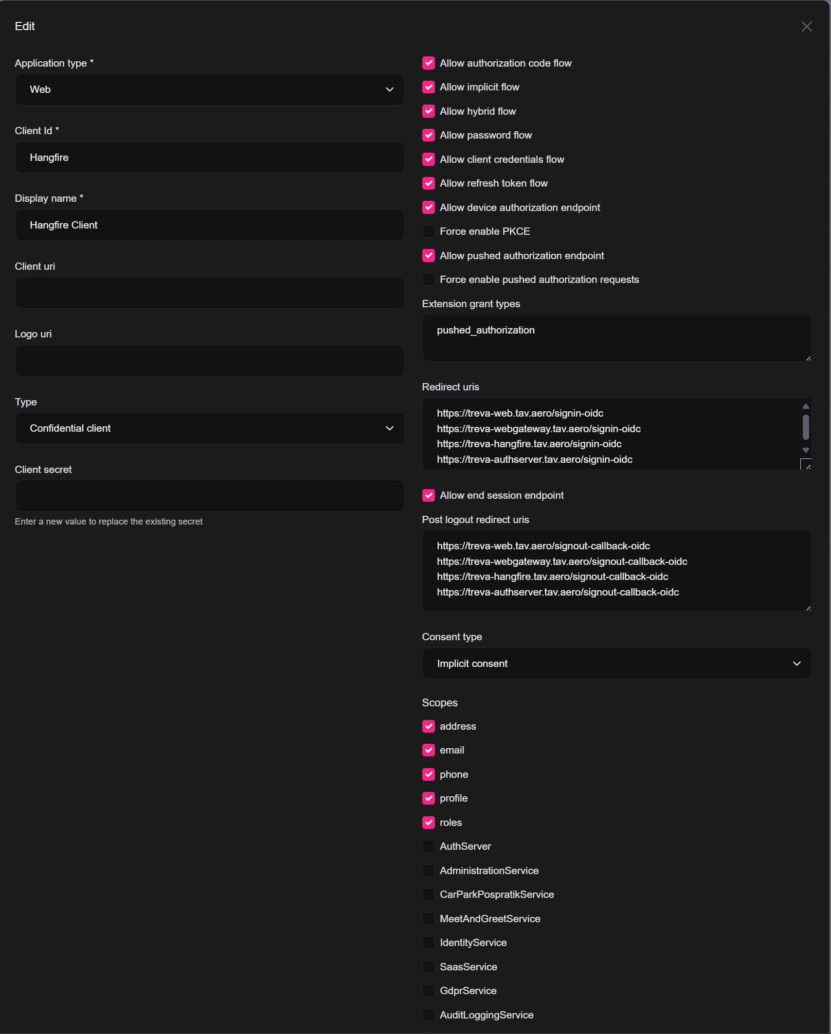 await CreateOrUpdateApplicationAsync( name: "Hangfire", type: OpenIddictConstants.ClientTypes.Confidential, consentType: OpenIddictConstants.ConsentTypes.Implicit, displayName: "Hangfire Client", secret: "1q2w3e*", grantTypes: [ OpenIddictConstants.GrantTypes.AuthorizationCode, OpenIddictConstants.GrantTypes.ClientCredentials, OpenIddictConstants.GrantTypes.RefreshToken, "pushed_authorization" ], scopes: [ OpenIddictConstants.Scopes.OpenId, OpenIddictConstants.Scopes.Profile, OpenIddictConstants.Scopes.Email, OpenIddictConstants.Scopes.Phone, OpenIddictConstants.Scopes.OfflineAccess, "roles", "HangfireService" ], redirectUris: [ "https://treva-hangfire.tav.aero/signin-oidc" ], postLogoutRedirectUris: [ "https://treva-hangfire.tav.aero/signout-callback-oidc" ] );Notes: