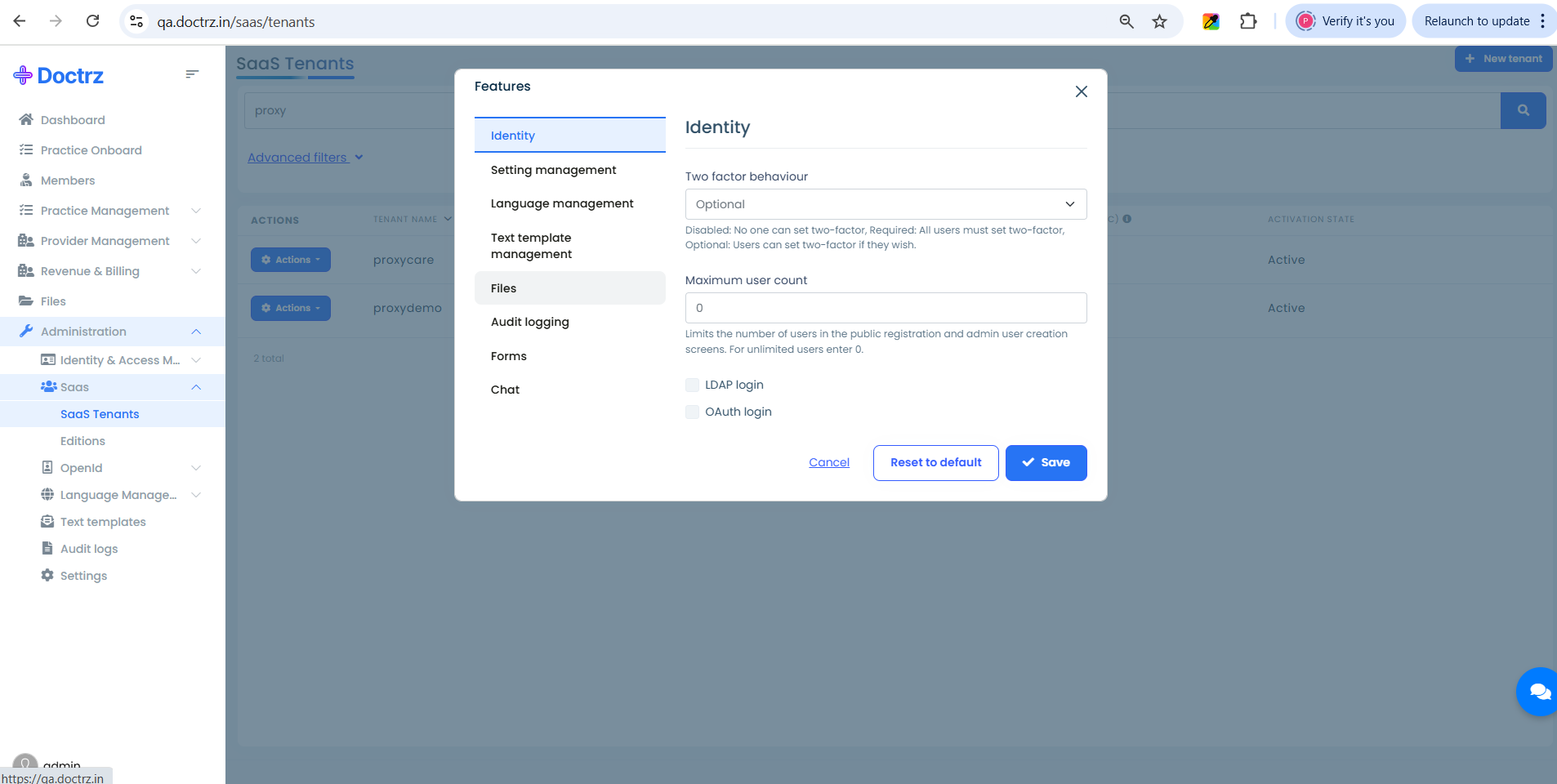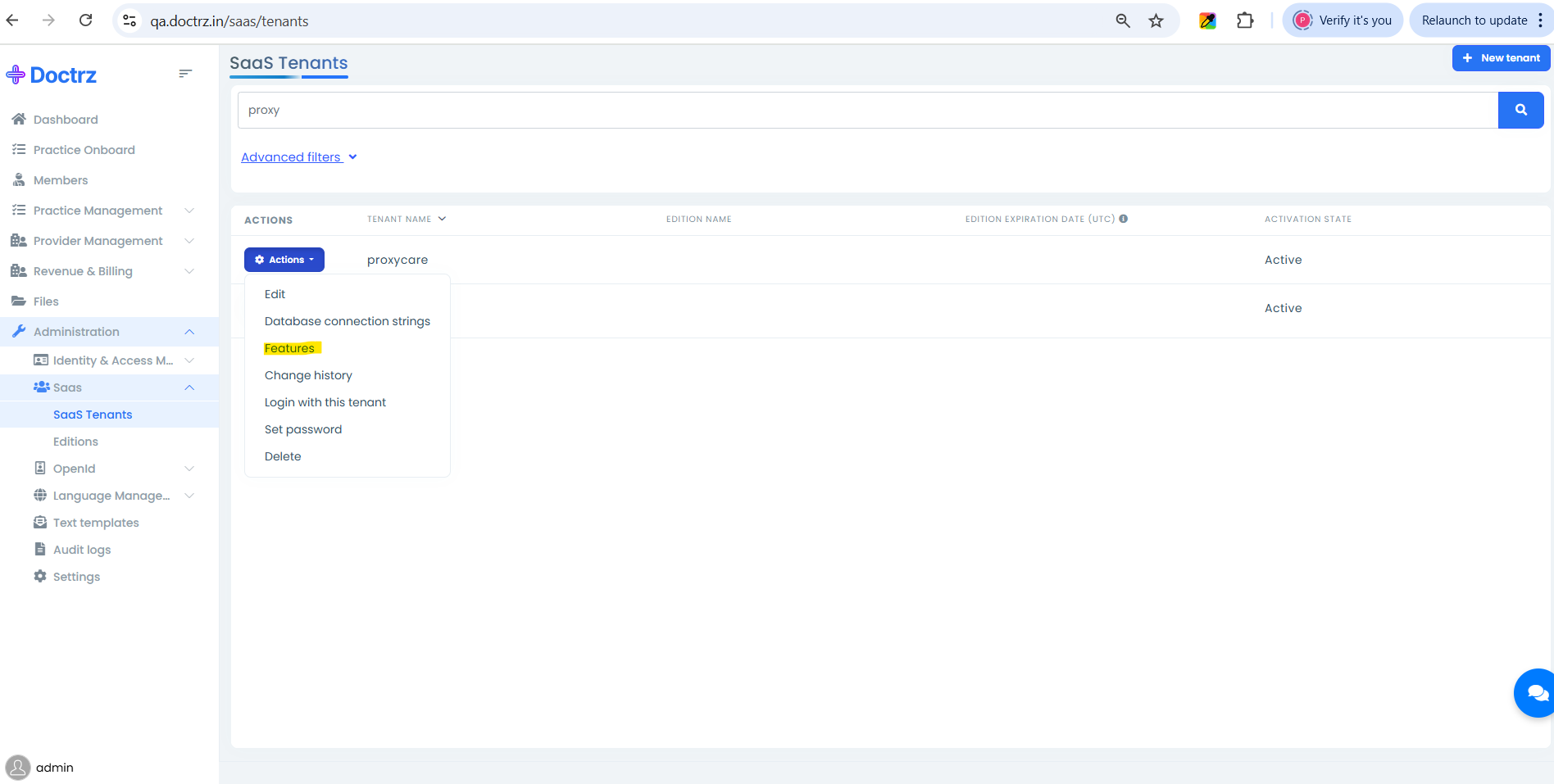 I logged in as a host admin and navigated to the** Administration > Saas > Saas Tenants** and selected the tenant , from the action items i have selected **Feature ** option