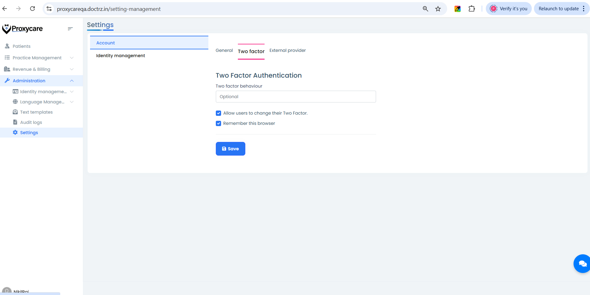 After that i have logged in as a tenant admin and navigated to Administration > Settings and selected Account > Two Factor tab and made Two Factor as optional and checked Allow users to change their Two Factor check box and Remember this browser check box.