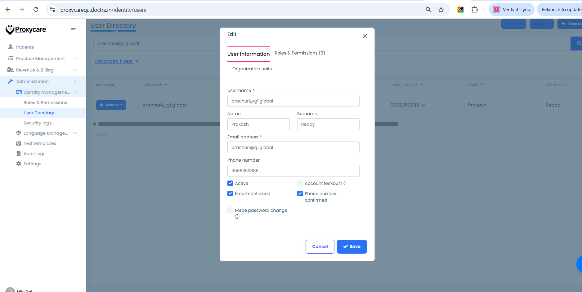 As a tenant admin i navigated to the Administration > User and selected a user and confirmed Email and Phone number