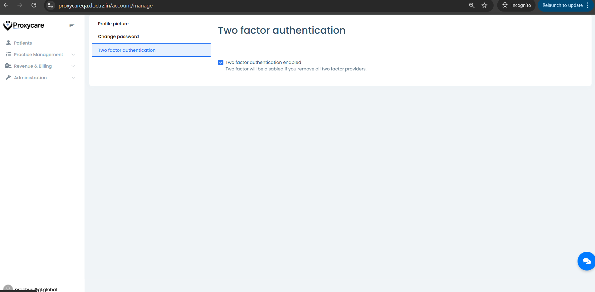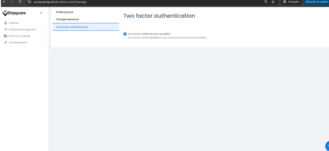 - I have enabled the two factor authentication for the admin user using this dropdown item in the screenshot