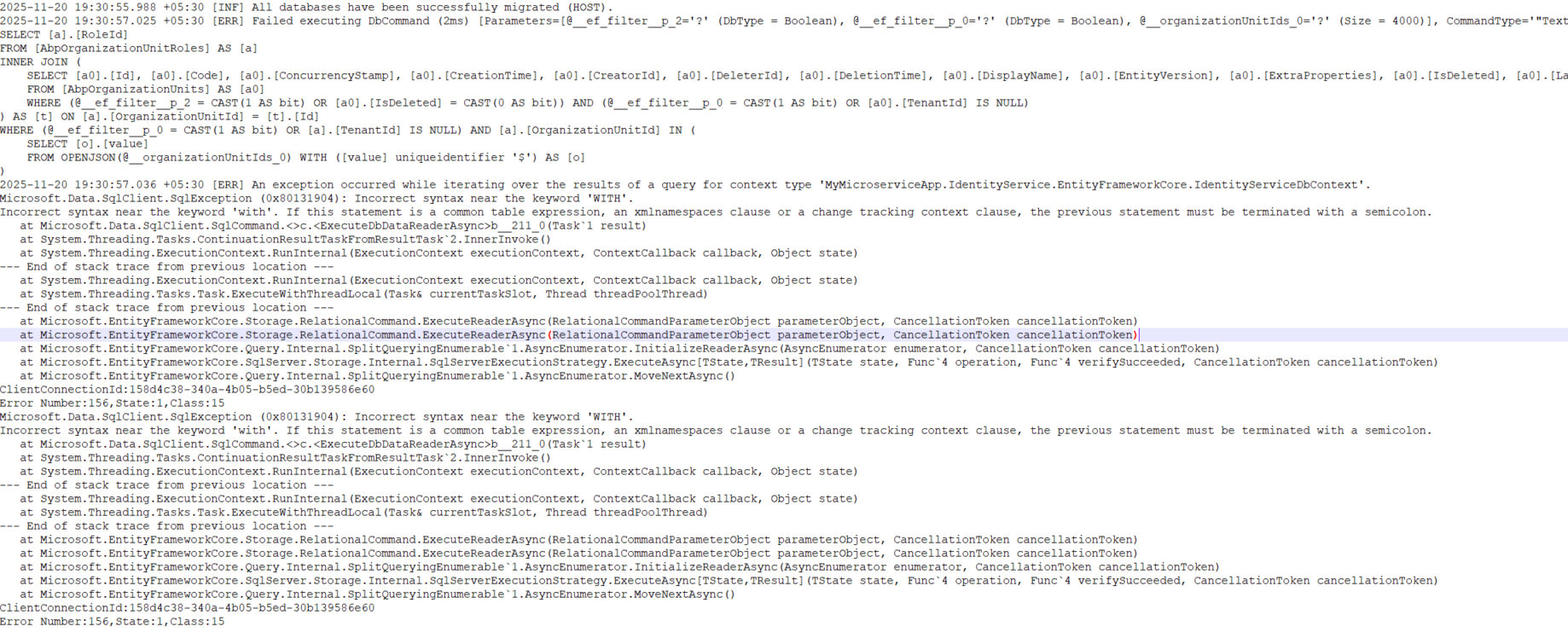 TranslateParameterizedCollectionsToConstantsSee https://abp.io/support/questions/8969/Bug-Incorrect-syntax-near-the-%27WITH%27-keyword#answer-3a18a703-1645-932a-5562-324eb131d644