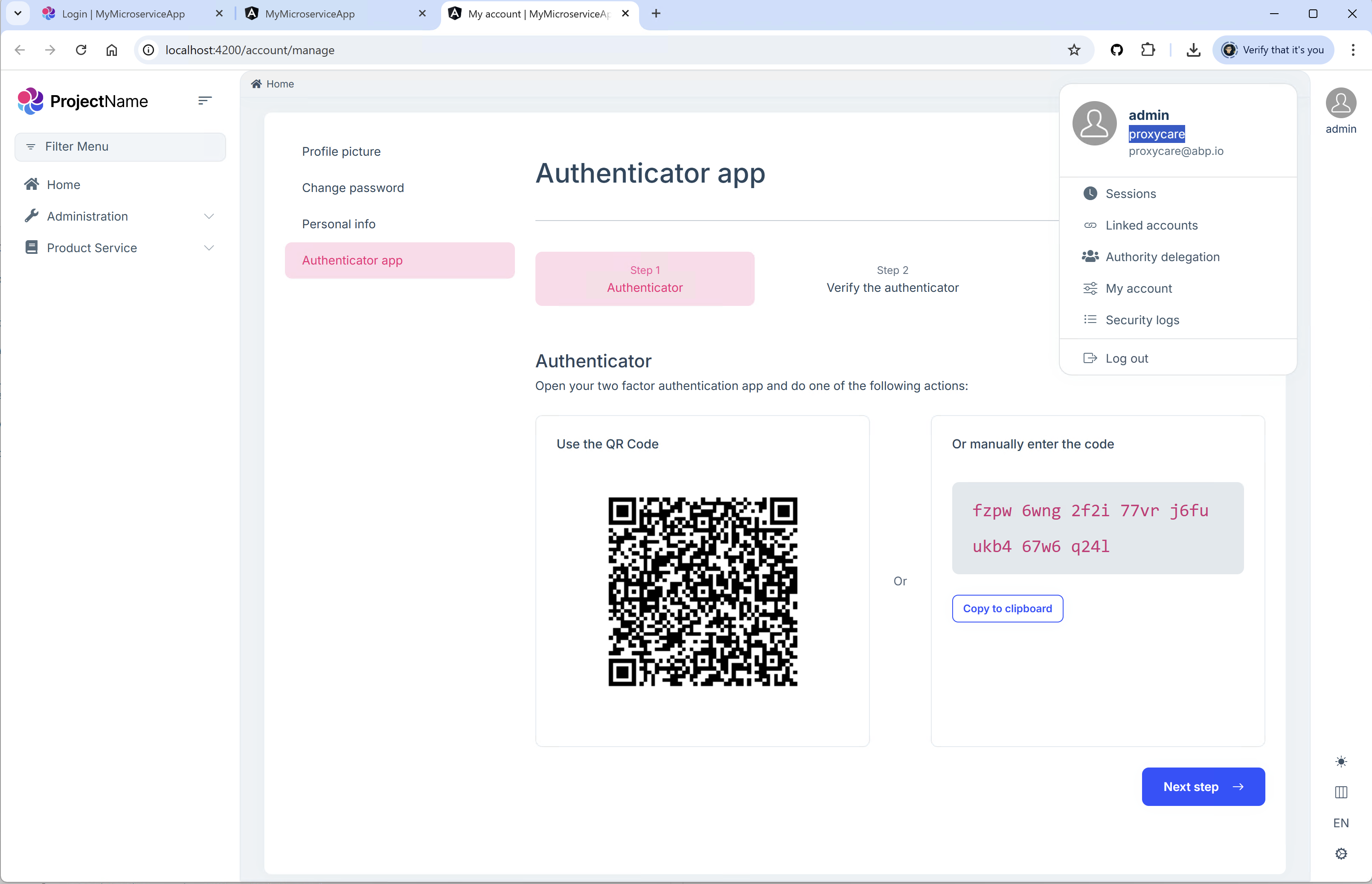 - The user must register an authenticator in their My Account > Security > Two-Factor page (the page shows QR code/secret to pair in Google Authenticator/Microsoft Authenticator, etc.). After pairing and confirming a TOTP code, ABP will mark authenticator as available.