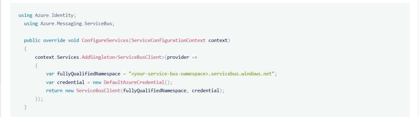 using Azure.Core; using Azure.Identity; using Azure.Messaging.ServiceBus; using Microsoft.Extensions.Options; using Volo.Abp; using Volo.Abp.AzureServiceBus; using Volo.Abp.Modularity; [DependsOn(typeof(AbpAzureServiceBusModule))] public class MyAzureServiceBusMiModule : AbpModule { public override void ConfigureServices(ServiceConfigurationContext context) { // Configure your namespace in options Configure<AbpAzureServiceBusOptions>(opt => { opt.Namespace = "<your-namespace>"; // e.g. mybusns // You can still set TopicName/SubscriptionName if you use ABP’s distributed event bus }); context.Services.AddSingleton<TokenCredential, DefaultAzureCredential>(); // Replace ServiceBusClient registration to use MI instead of connection string context.Services.AddSingleton<ServiceBusClient>(sp => { var options = sp.GetRequiredService<IOptions<AbpAzureServiceBusOptions>>().Value; var credential = sp.GetRequiredService<TokenCredential>(); // Fully qualified namespace: "<namespace>.servicebus.windows.net" var fqn = $"{options.Namespace}.servicebus.windows.net"; return new ServiceBusClient(fqn, credential); }); // Optionally: if you use sender/processor factories relying on ConnectionPool, // you can replace IConnectionPool with your own implementation. context.Services.Replace(ServiceDescriptor.Singleton<IConnectionPool, ManagedIdentityConnectionPool>()); } } // Example minimal pool that creates clients using MI when no connection string is present public class ManagedIdentityConnectionPool : IConnectionPool { private readonly ConcurrentDictionary<string, ServiceBusClient> _clients = new(); private readonly TokenCredential _credential; public ManagedIdentityConnectionPool(TokenCredential credential) { _credential = credential; } public ServiceBusClient Get(string fullyQualifiedNamespace, string? connectionString = null) { // Prefer connection string when provided, otherwise use MI return _clients.GetOrAdd(fullyQualifiedNamespace, ns => { if (!string.IsNullOrWhiteSpace(connectionString)) { return new ServiceBusClient(connectionString); } return new ServiceBusClient(ns, _credential); }); } }Notes: