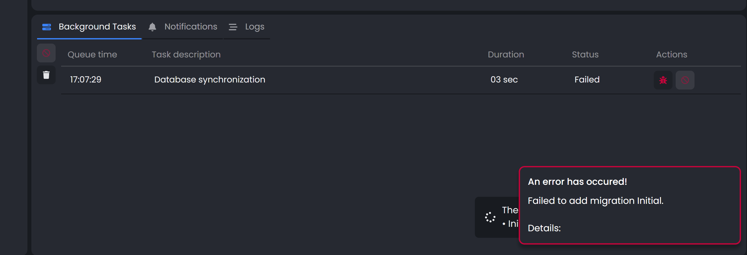 - Open Studio > Logs (Background Tasks) and copy any EF/restore errors.