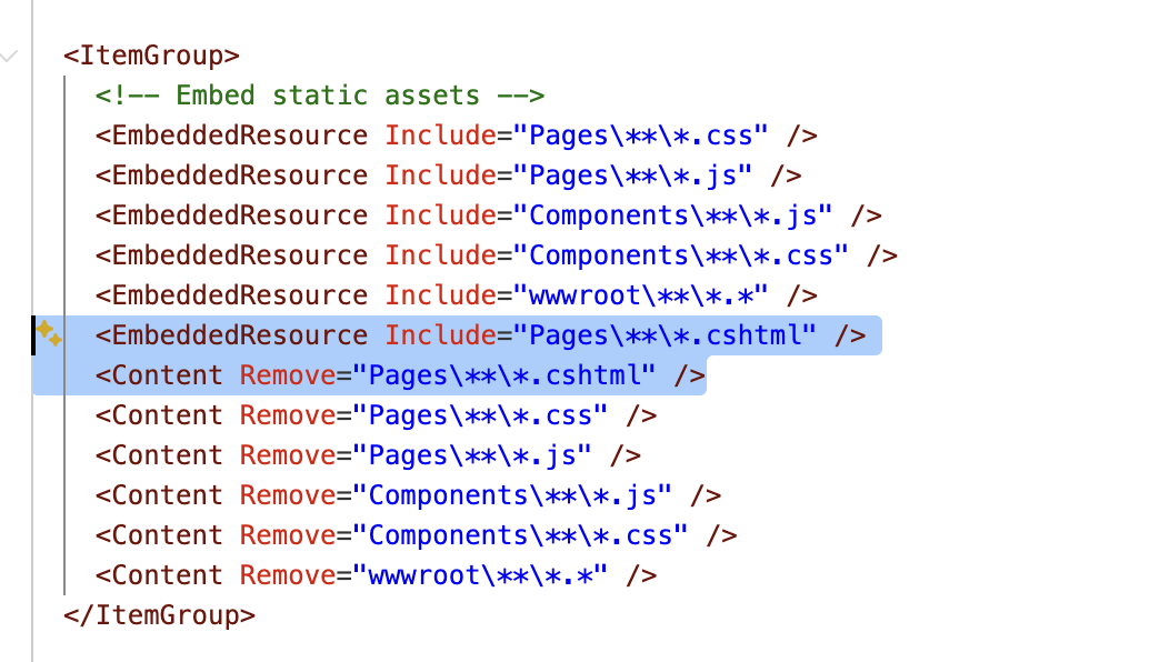 <ItemGroup> <!-- Embed static assets --> <EmbeddedResource Include="Pages\**\*.css" /> <EmbeddedResource Include="Pages\**\*.js" /> <EmbeddedResource Include="Components\**\*.js" /> <EmbeddedResource Include="Components\**\*.css" /> <EmbeddedResource Include="wwwroot\**\*.*" /> <EmbeddedResource Include="Pages\**\*.cshtml" /> <!-- Explicitly mark for Razor compilation --> <RazorGenerate Include="Pages\**\*.cshtml" /> <Content Remove="Pages\**\*.css" /> <Content Remove="Pages\**\*.js" /> <Content Remove="Components\**\*.js" /> <Content Remove="Components\**\*.css" /> <Content Remove="wwwroot\**\*.*" /> </ItemGroup>build succeeds and verified the Compiled Razor Views Are in the DLL with