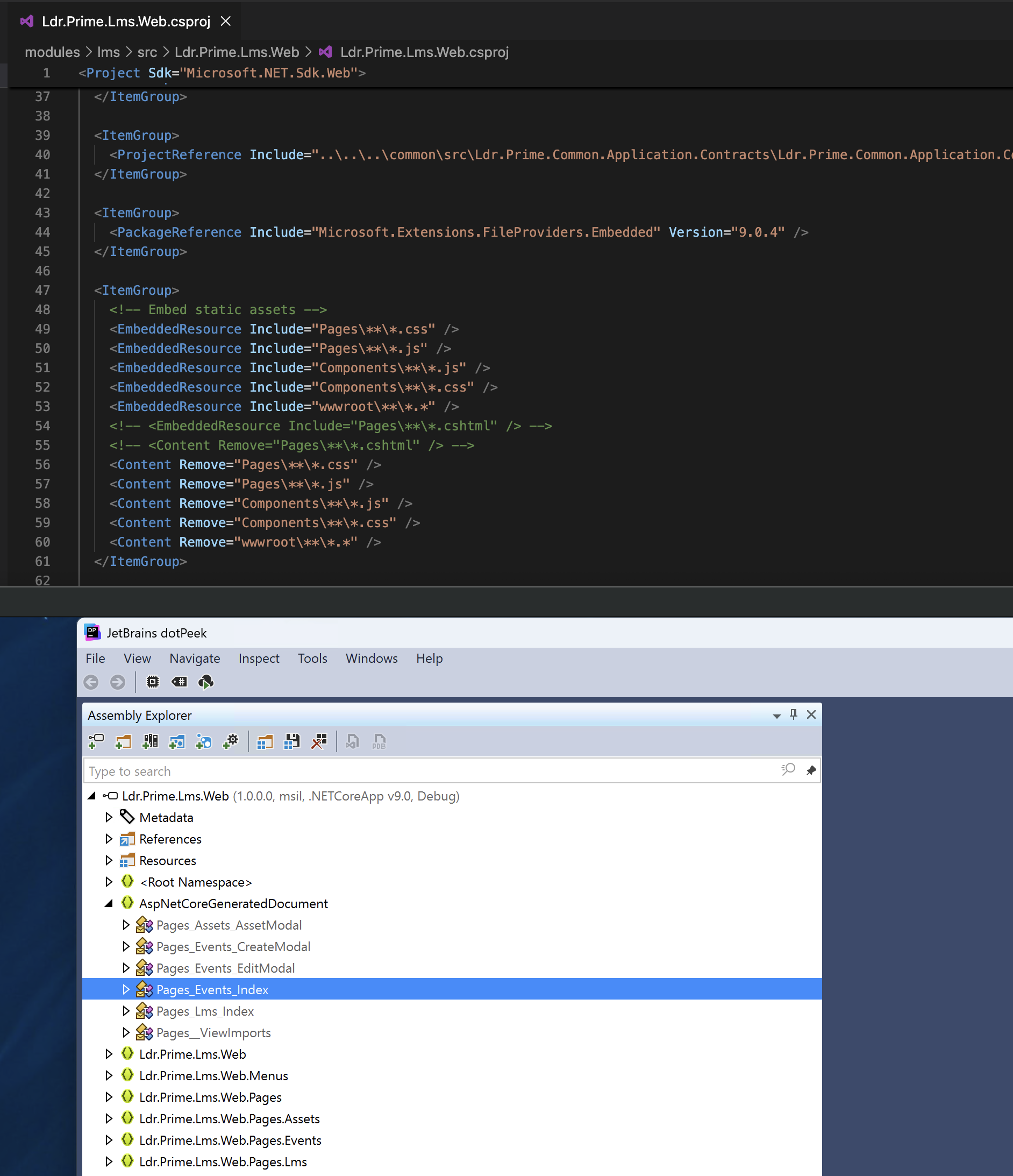 <ItemGroup> <!-- Embed static assets --> <EmbeddedResource Include="Pages\**\*.css" /> <EmbeddedResource Include="Pages\**\*.js" /> <EmbeddedResource Include="Components\**\*.js" /> <EmbeddedResource Include="Components\**\*.css" /> <EmbeddedResource Include="wwwroot\**\*.*" /> <EmbeddedResource Include="Pages\**\*.cshtml" /> <!-- Explicitly mark for Razor compilation --> <RazorGenerate Include="Pages\**\*.cshtml" /> <Content Remove="Pages\**\*.css" /> <Content Remove="Pages\**\*.js" /> <Content Remove="Components\**\*.js" /> <Content Remove="Components\**\*.css" /> <Content Remove="wwwroot\**\*.*" /> </ItemGroup>build succeeds and verified the Compiled Razor Views Are in the DLL with findstr /s /i "AspNetCore" Ldr.Prime.Lms.Web.dll