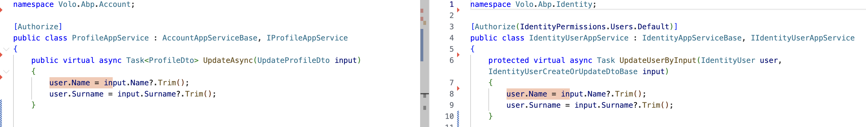 using System.Threading.Tasks; using Volo.Abp.Application.Services; using Volo.Abp.DependencyInjection; using Volo.Abp.Identity; using Volo.Abp.Users; [Dependency(ReplaceServices = true)] public class MyIdentityUserAppService : IdentityUserAppService { public MyIdentityUserAppService( IdentityUserManager userManager, IIdentityUserRepository userRepository, IIdentityRoleRepository roleRepository) : base(userManager, userRepository, roleRepository) { } public override async Task<IdentityUserDto> UpdateAsync(Guid id, IdentityUserUpdateDto input) { // Load current (old) values var oldUser = await UserRepository.GetAsync(id); var oldSurname = oldUser.Surname; var oldEmail = oldUser.Email; // Call the default update pipeline var result = await base.UpdateAsync(id, input); // Compare with new values var newSurname = result.Surname; var newEmail = result.Email; if (!string.Equals(oldSurname, newSurname, StringComparison.Ordinal)) { // Your logic when surname changed // e.g., publish a distributed event, call an external service, etc. } if (!string.Equals(oldEmail, newEmail, StringComparison.OrdinalIgnoreCase)) { // Your logic when email changed } return result; } }- Registering with [Dependency(ReplaceServices = true)] ensures your app service is used for the /api/identity/users/{id} endpoint. This gives you precise control and easy old/new comparison.