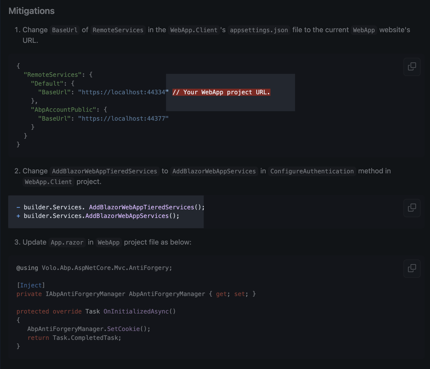 { "App": { "SelfUrl": "https://your-public-host" }, "AuthServer": { "Authority": "https://your-public-host", "ClientId": "Your_Blazor_Client", "ResponseType": "code" }, "RemoteServices": { "Default": { "BaseUrl": "https://your-public-host" } } }- Sources