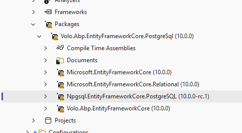 - What you see is expected for ABP 10.0.0 at the moment. ABP 10 targets .NET/EF Core 10, and the Npgsql EF Core provider published a matching 10.0.0-rc1 package when ABP 10.0.0 shipped. Therefore, Volo.Abp.EntityFrameworkCore.PostgreSql brings Npgsql.EntityFrameworkCore.PostgreSQL 10.0.0-rc1 transitively.