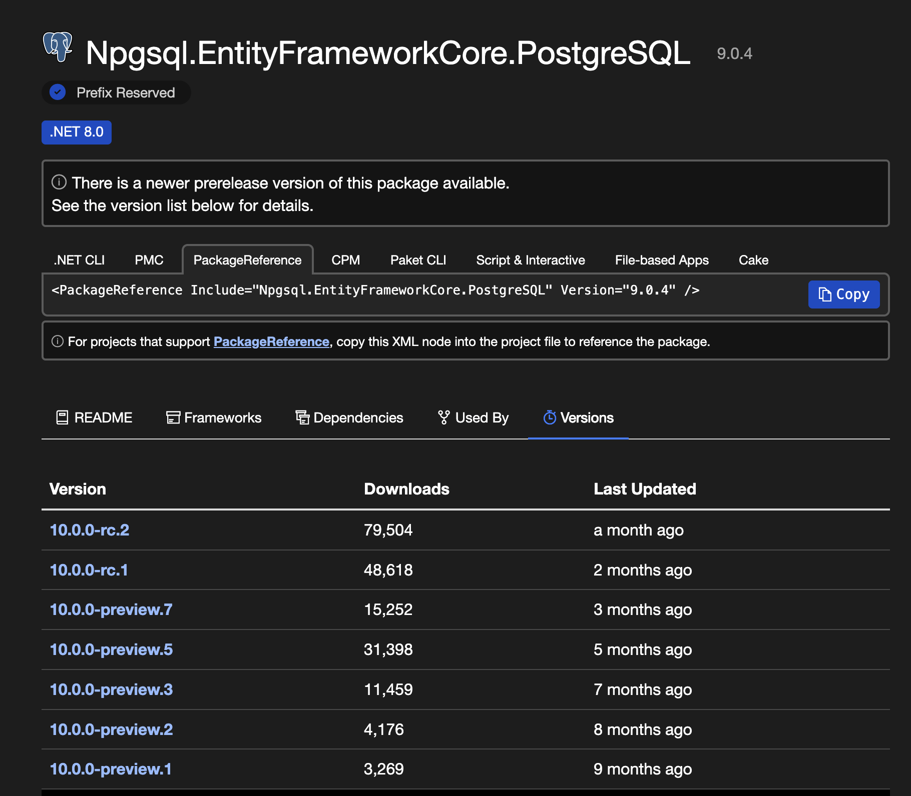 - NuGet – Npgsql.EntityFrameworkCore.PostgreSQL 10.0.0: https://www.nuget.org/packages/Npgsql.EntityFrameworkCore.PostgreSQL/10.0.0
