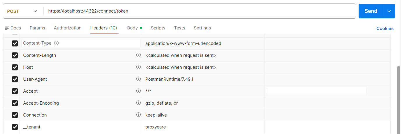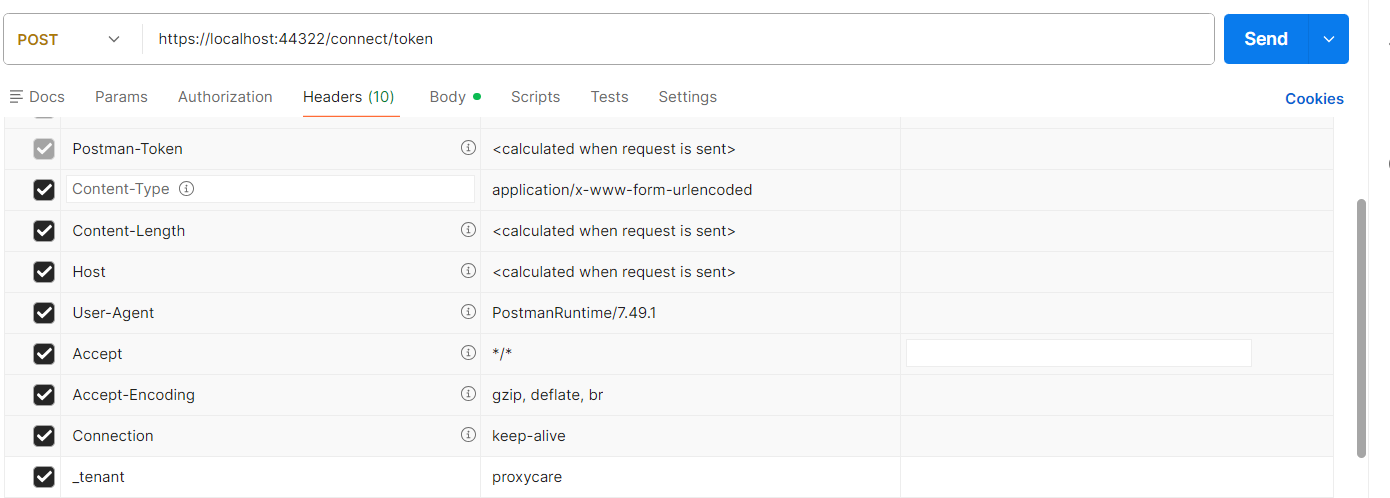 Example curl (equivalent to Postman) curl -X POST "https://localhost:44322/connect/token" ^ -H "Content-Type: application/x-www-form-urlencoded" ^ -H "Abp-TenantId: 11111111-1111-1111-1111-111111111111" ^ --data-urlencode "grant_type=password" ^ --data-urlencode "username=admin@mytenant.com" ^ --data-urlencode "password=1q2w3E*" ^ --data-urlencode "client_id=MyAngular_App" ^ --data-urlencode "client_secret=1q2w3e*" ^ --data-urlencode "scope=openid profile email roles offline_access MyProjectName"