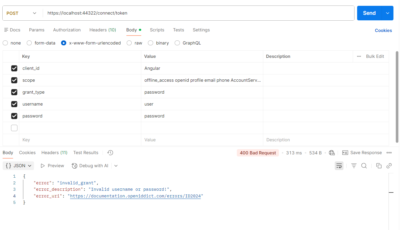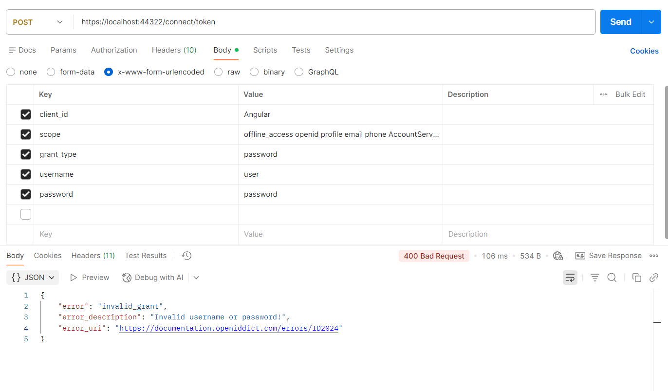 { "error": "invalid_grant", "error_description": "Invalid username or password!", "error_uri": "https://documentation.openiddict.com/errors/ID2024" }