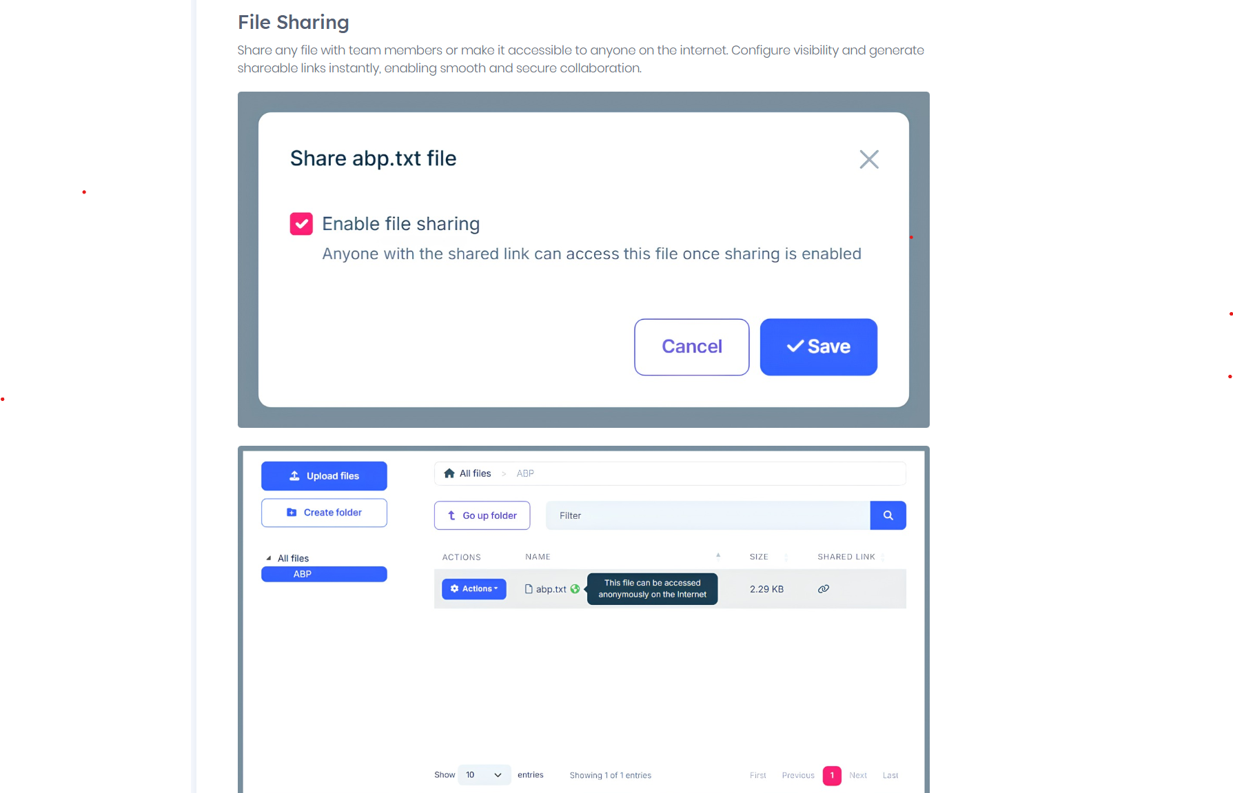 - What “File Sharing” is: It is a built-in feature of the ABP Commercial File Management module that allows you to generate an anonymous, shareable link for a file so that users without authentication can access it. It is part of the module’s UI and application layer; you don’t need a separate provider or package for “sharing.”
