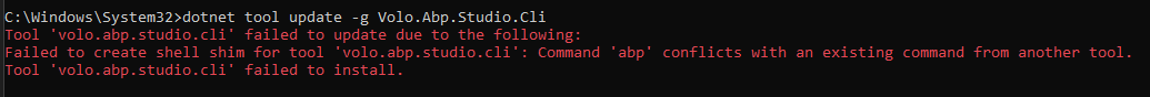 Failed to create shell shim for tool 'volo.abp.studio.cli': Command 'abp' conflicts with an existing command from another tool.