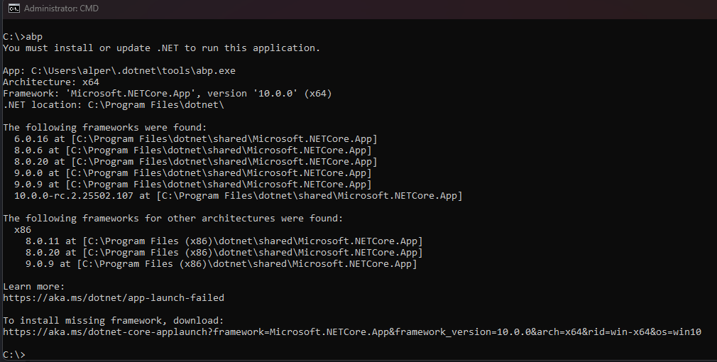 dotnet tool uninstall -g volo.abp.studio.cli- Install .NET 10 SDK (you can use winget for silent install):