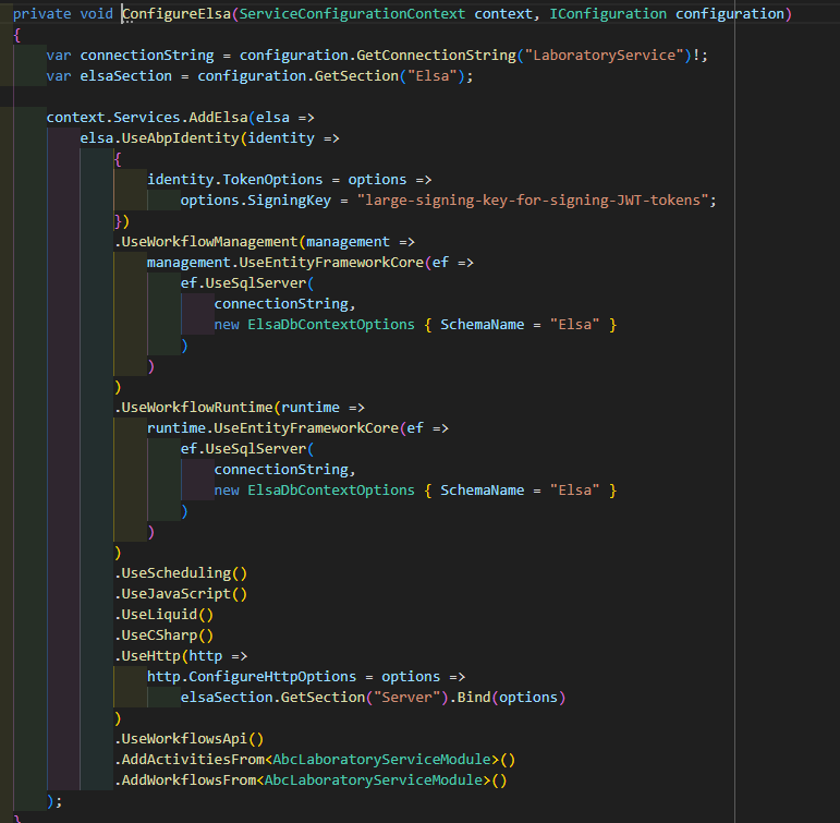 public override void ConfigureServices(ServiceConfigurationContext context) { var configuration = context.Services.GetConfiguration(); var elsaSection = configuration.GetSection("Elsa"); context.Services.AddElsa(elsa => elsa .UseEntityFrameworkPersistence(ef => DbContextOptionsBuilderExtensions.UseSqlServer( ef, configuration.GetConnectionString("Default"))) .AddHttpActivities(elsaSection.GetSection("Server").Bind) .AddQuartzTemporalActivities() .AddJavaScriptActivities() .AddWorkflowsFrom<Startup>() // optional: scan and register workflows ); context.Services.AddElsaApiEndpoints(); // ABP Anti-forgery exception for Elsa API endpoints Configure<AbpAntiForgeryOptions>(options => { options.AutoValidateFilter = type => type.Assembly != typeof(Elsa.Server.Api.Endpoints.WorkflowRegistry.Get).Assembly; }); // CORS for Studio if served from a different origin context.Services.AddCors(cors => cors.AddDefaultPolicy(policy => policy .AllowAnyHeader() .AllowAnyMethod() .AllowAnyOrigin() .WithExposedHeaders("Content-Disposition"))); } public override void OnApplicationInitialization(ApplicationInitializationContext context) { var app = context.GetApplicationBuilder(); app.UseCors(); app.UseHttpActivities(); // for HTTP activities app.UseConfiguredEndpoints(); }- appsettings.json (server base URL for Elsa HTTP activities):