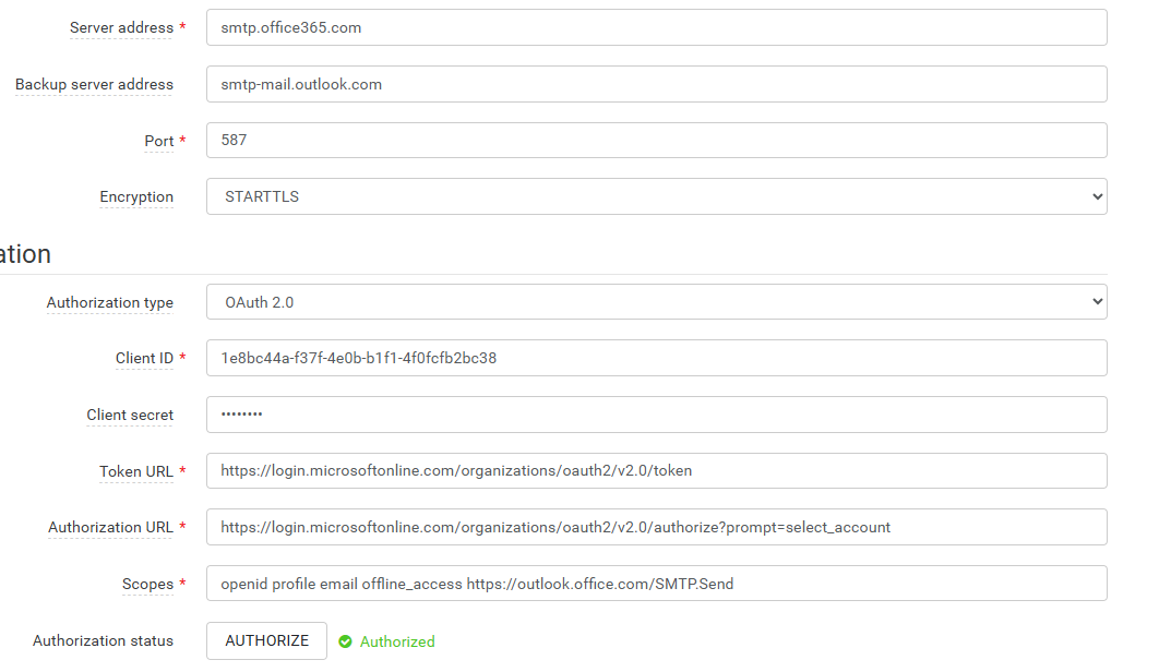 - Scopes (space-separated): openid profile email offline_access https://outlook.office.com/SMTP.Send