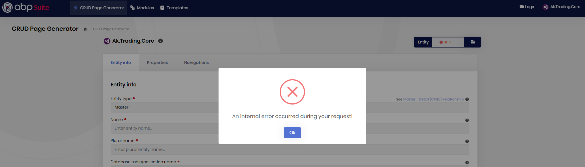 Autofac.Core.DependencyResolutionException: An exception was thrown while activating Volo.Abp.Suite.Controllers.CrudPageGeneratorController -> Volo.Abp.Suite.Areas.AbpSuite.CrudPageGenerator.Commands.CrudPageGenerator -> Volo.Abp.Suite.Areas.AbpSuite.CrudPageGenerator.Services.CustomCodeFileNestingService -> Volo.Abp.Suite.Areas.AbpSuite.CrudPageGenerator.Services.TemplateService -> λ:Volo.Abp.Suite.Areas.AbpSuite.CrudPageGenerator.Helpers.CodeFormatting.ICodeFormatter -> Volo.Abp.Suite.Areas.AbpSuite.CrudPageGenerator.Helpers.CodeFormatting.CodeFormatter -> Volo.Abp.Suite.Areas.AbpSuite.CrudPageGenerator.Helpers.CodeFormatting.JavascriptPrettierFormatter.