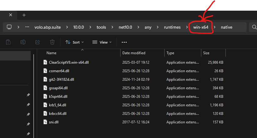 ClearScriptV8.win-arm64.dllto the..\volo.abp.suite\10.0.0\tools\net10.0\any\runtimes\win-arm64\nativefolder fixed the issue.While this workaround works, still keeping this issue open so that an ABP developer can fix this in future releases.