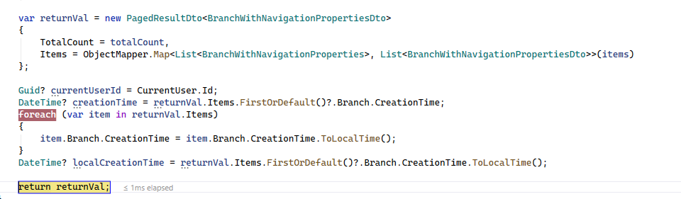 - Or, if you really must return localized values for a specific endpoint, use IClock.ConvertToUserTime on a dedicated “view”/presentation DTO and mark the property as string (already formatted) or DateTimeOffset with proper offset. Avoid mixing with standard CRUD DTOs which should remain UTC.